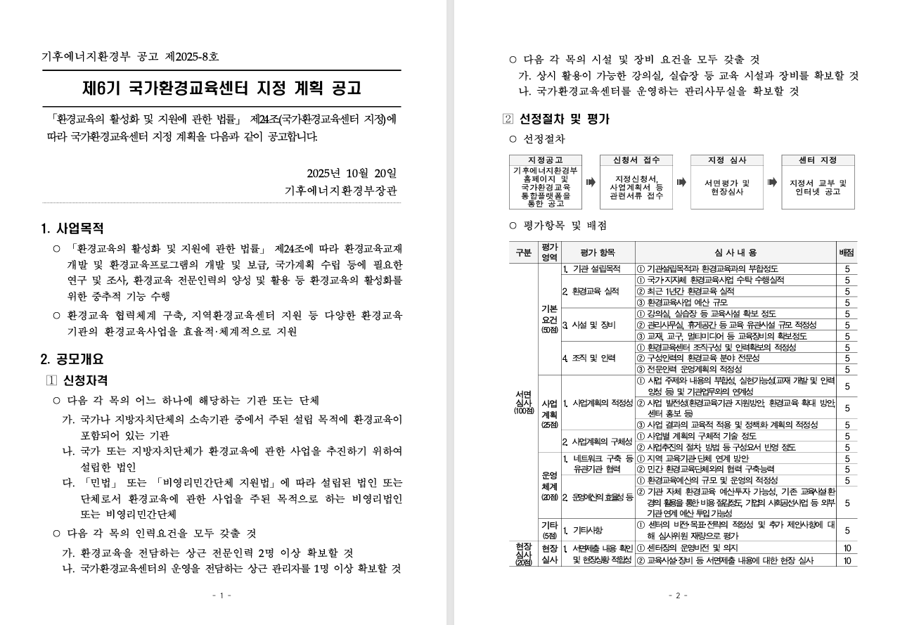 제6기 국가환경교육센터 지정 계획 공고