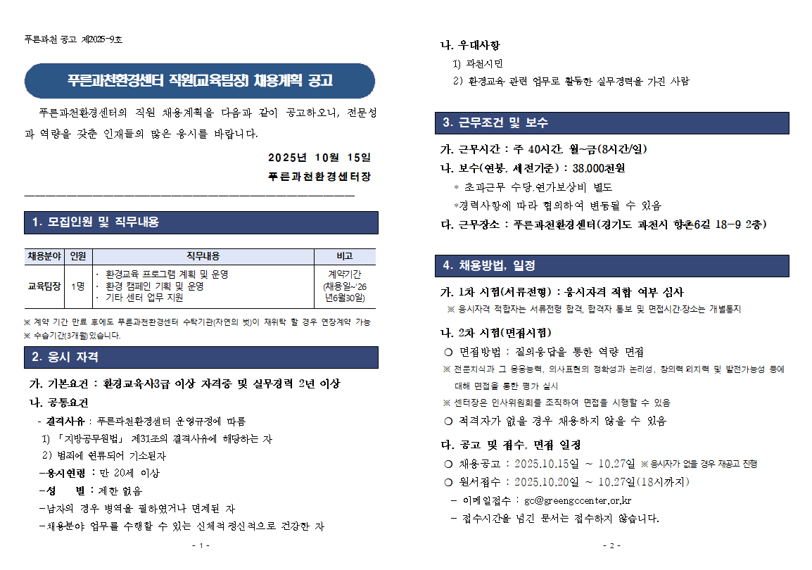 본 채용공고는 푸른과천환경센터의 요청에 따라 게시 되었습니다.