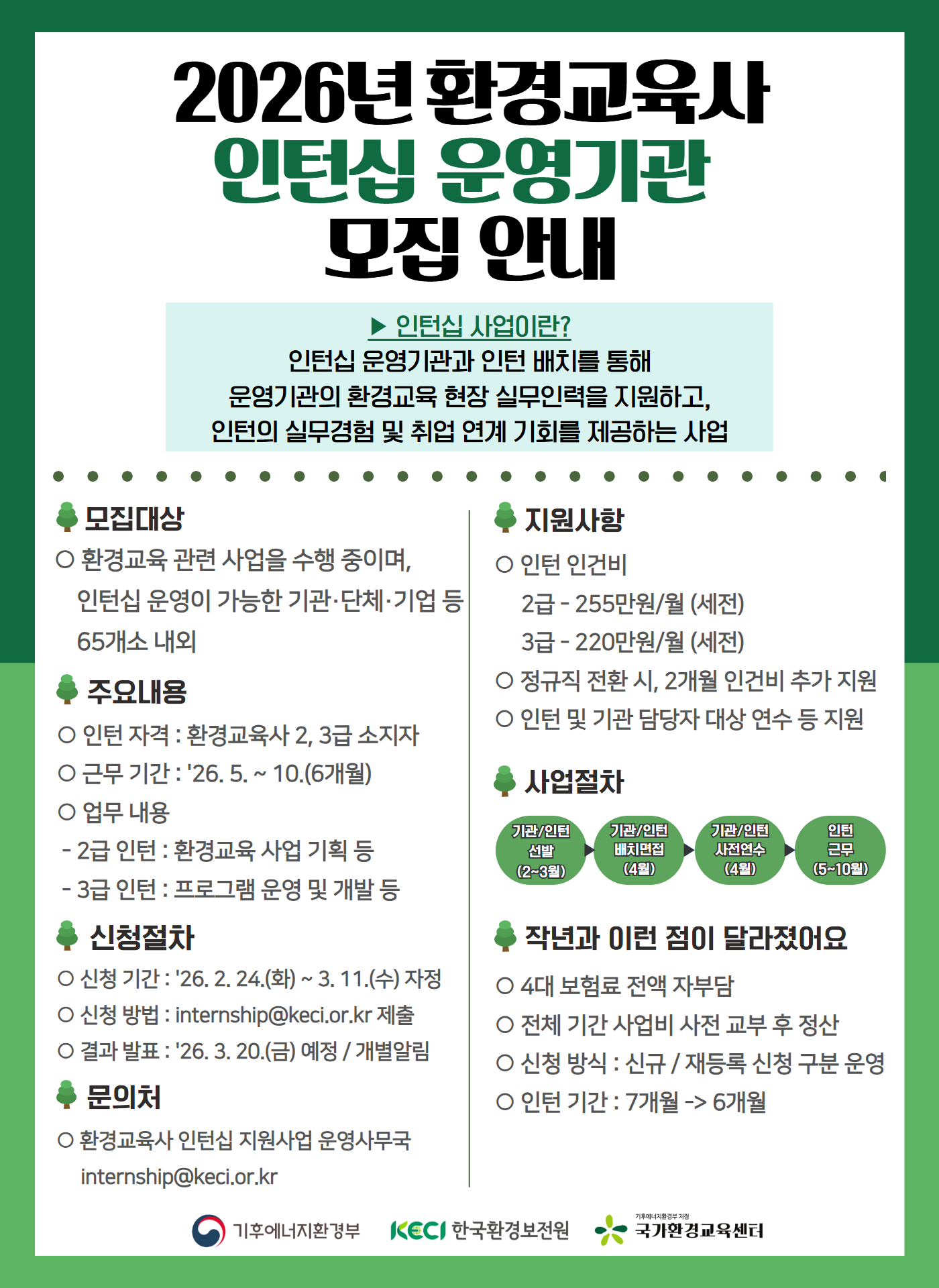 관심 있으신 기관에서는 「2026년 환경교육사 인턴십 모집공고문」을 참고하시어, 기한 내에 신청하시길 바랍니다.